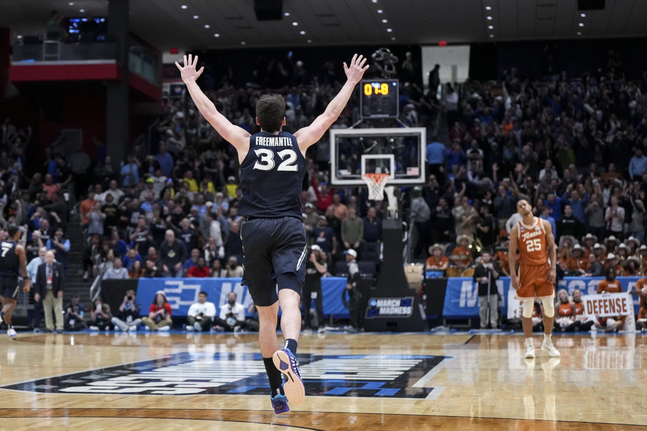 Zach Freemantle of the Xavier Musketeers celebrates as the clock runs out against the Texas Longhorns during the First Four round of the 2025 NCAA Men’s Basketball Tournament. (Photo by Grace Bradley/NCAA Photos via Getty Images)